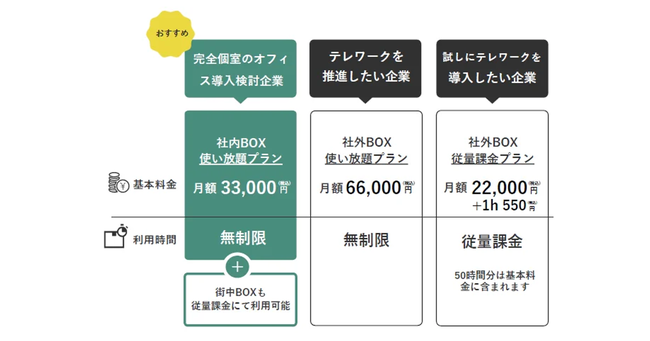 プランは大きく3つあり、「定額プラン」「50時間分利用可能の従量プラン」「自社設置BOXの定額プラン」となっております。