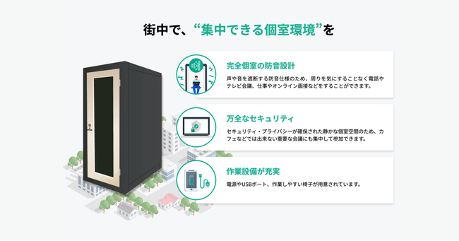 「RemoteworkBOX」は、遊休スペースに、工事不要で構築が可能です。そのため、都市部のリモートワーカーが多い拠点に多く設置し、顧客満足度をより向上させることが可能です。