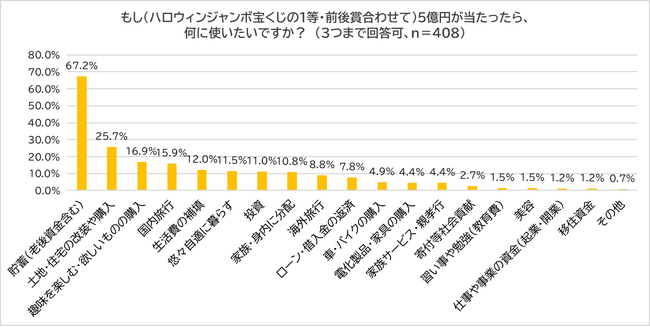 最後に、「普段『くじ』を買う」と回答した408人に「もし(ハロウィンジャンボ宝くじの1等・前後賞合わせて)5億円が当たったら、何に使いたいか?」聞きました。「貯蓄(老後資金も含む)」(67.2%)が最多となり、「土地・住宅の改装や購入」(25.7%)、「趣味を楽しむ・欲しいものの購入」(16.9%)、「国内旅行」(15.9%)、「生活費の補填」(12.0%)と続きました。