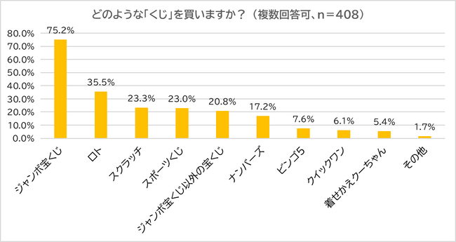 「はい」と回答した408人に「どのような『くじ』を買うか?」聞きました。75.2%が「ジャンボ宝くじ」と回答し最多、以下「ロト」(35.5%)、「スクラッチ」(23.3%)、「スポーツくじ」(23.0%)、「ジャンボ宝くじ以外の宝くじ」(20.8%)と続き、「ジャンボ宝くじ」の人気の高さがうかがえました。
