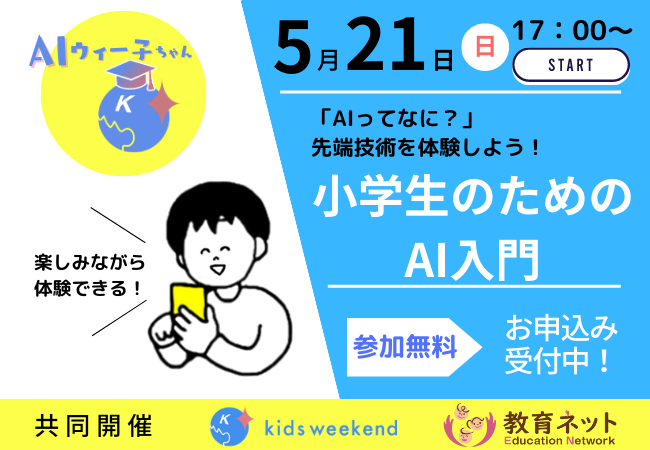 (※1)「AIウィー子ちゃん」は、OpenAIが開発した大規模言語モデル「ChatGPT」を活用した小学生の疑問に答えるキッズAI博士。子どもたちが抱える学習・生活上の疑問や質問を解決するために、オンライン上でのサポートを提供する。会員登録なしで、24時間365日、全国どこからでも無料で利用できる。詳細 https://www.kidsweekend.jp/portal/explore(※2)人工知能の研究開発機関OpenAIにが開発した、対話側人工知能チャットボット先端技術に触れ、専門家と共に「デジタル社会の良き担い手」をはぐくむ機会を提供 共同オンライン授業では、教育ネットのネットリテラシーアドバイザーを務める古賀 大吉氏が講師となり、当社のキッズAI博士「AIウィー子ちゃん」を用いて実際にAIを使用しながら、仕組みや使い方を楽しく体験することができます。さらに、子どもたちがこれからどのようにAIを使っていくべきなのかをはじめとする「デジタル社会の良き担い手」を育成していく機会となることを目標としております。 お子様に生成AIとの安全性に配慮した正しいつき合い方を教えたいとお考えの保護者様や教育現場の方々に、お子様の学ぶ機会としてぜひご活用ください。 ご視聴には事前登録が必要となります。お申込みをお待ちしております。■開催概要日時:2023年5月21日(日) 17:00〜18:00視聴方法:オンライン(事前申し込み必須)お申込みURL:https://www.kidsweekend.jp/portal/events/976E6CDF対象:小学校3年生〜6年生参加費:無料準備いただくもの:受講用パソコン、受講用パソコン以外に検索で用いるスマートフォンなどの端末詳しくは info@kidsweekend.jp までお問い合わせください。