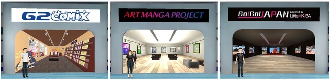 上から、デジタルコミックをバーチャル書店として展開する「ジーツーコミックス」、人気漫画家のアート作品を展示するギャラリー「ART MANGA PROJECT」、神田神保町や秋葉原などの千代田区や和歌山県、香川県などの観光の魅力を国内外に発信する「Go!Go!JAPAN powered by LittleAKIBA」。