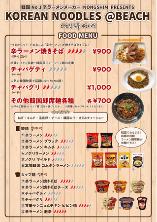 新型コロナウイルス感染症の5類移行に伴い、今年の夏は例年以上に多くの人がビーチに訪れることが予想されます。そんな中、当社では若者に人気の江の島にある海の家にて、期間限定店舗を出店いたします。店舗で旨辛い味わいの「辛ラーメン焼きそば」、韓国風ジャージャン麺「チャパゲティ」、韓国映画でも話題になった「チャパグリ」など人気の“汁なし麺”3種を使用した料理を提供します。