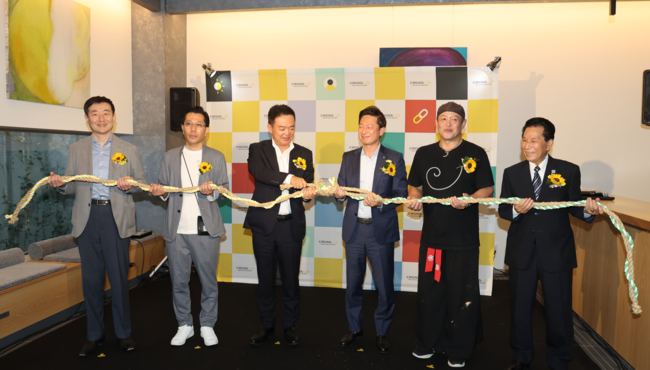 地域とのつながりやクロスライフがあらゆる結びを作っていくことを表現し、博多三大祭の博多山笠祭で使われる”かき縄”を用いたセレモニーを執り行いました。福岡市 経済観光文化局理事 吉田 宏幸氏をはじめ、福岡南天神振興会 会長 楠下 広師氏、小石原焼・カネハ窯三代目の熊谷 裕介氏、オリックス・ホテルマネジメント株式会社 取締役社長 似内 隆晃、同社執行役員 営業本部長 森 直樹、クロスライフ博多天神・クロスライフ博多柳橋 総支配人 高橋 信晴の6名がかき縄を手にして新たな結びをつくり、ホテルの幕開けを祝いました。