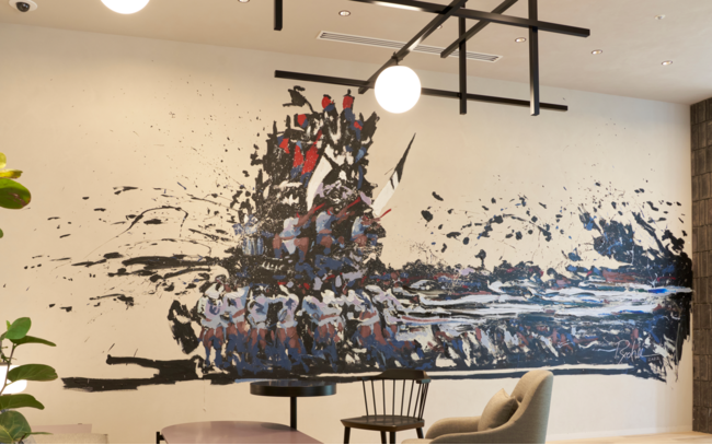 福岡出身で、「躍動」を一貫としたテーマに掲げる山下良平氏によるウォールペイントがロビーエントランス横に位置し、皆さまをお迎えします。博多祇園山笠がモチーフで、今にも動き出しそうな勢いのある様子をダイナミックに描き上げています。