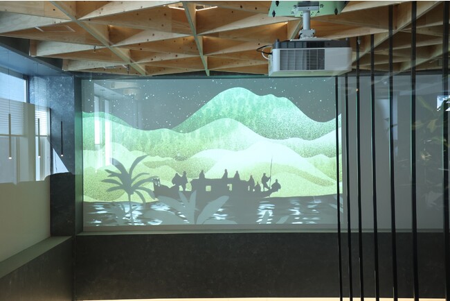 ミュージシャン/映像ディレクターであるVIDEOTAPEMUSICによるディレクションのもとクロスライフのために制作された映像音楽作品が、フロントロビー上部のスクリーンで常時流れます。作品のコンセプトは「移動」。福岡・博多が、古代から現代にいたるまで大陸や半島との交易を続けてきたこと、多くの川が街中を交錯し今でも人々の交流地点であること、小石原焼をはじめ九州北部に根付く伝統工芸の多くが大陸由来であることを踏まえて制作されました。地域の歴史やルーツが垣間見えるアート作品です。