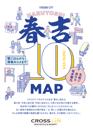 2つのクロスライフを結ぶ「春吉エリア」は、昼の街・天神と夜の街・中州に挟まれた、日常と非日常が交錯する場所であり、古き良き街並みが今も残ります。本MAPでは、各ホテルから徒歩10分圏内にある、お手頃かつ味自慢の個性的な飲食店やカフェなど地元ならではの情報をまじえて紹介しています。気軽に散策に行ける距離にあるおすすめスポットに、ぜひ足を運んでみてください。