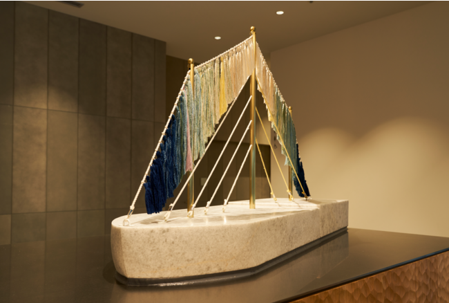 福岡県在住の彫刻家、稲葉彬子氏が手掛ける、ホテルが立地する春吉地区の歴史と隣接の柳橋連合市場とのつながりをモチーフとした舟のアートが、エントランスで訪れた皆さまをお迎えします。本作品は、参加型のアートであり、「結び・縁」をコンセプトにしています。SDGsに配慮し小倉織の端材を有効活用しています。その端材からできた紐をチェックイン時にお渡しし、ゲスト自ら舟にかかる紐に結んでいただきます。季節に合わせて模様替えし、訪れる度にアートの新しい表情をお楽しみいただけます。