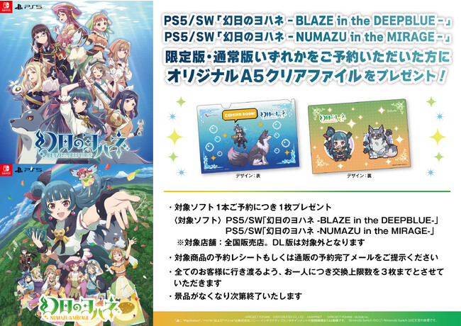 『幻日のヨハネ -BLAZE in the DEEPBLUE-』もしくは『幻日のヨハネ - NUMAZU in the MIRAGE -』の予約レシート/予約完了メールをご提示いただいた方に、2タイトルがコラボレーションした特別なデザインの「オリジナルA5クリアファイル」をプレゼント!