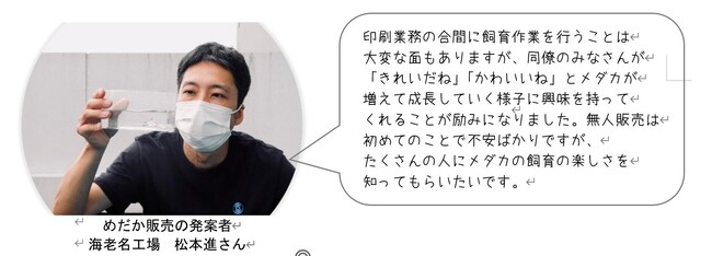 今回の無人販売開始は小さなスタートですが、地域住民やメダカ愛好家のみなさまの憩いの場として、気軽に立ち寄れる場所としてご利用いただけるよう、内容を充実させてまいります。今後の展開にどうぞご期待ください。