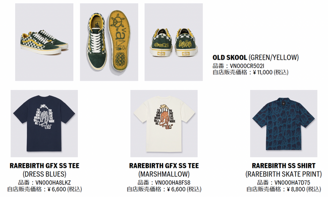 今回のコレクションでRarebirthは、スケートボーダーのタフなメンタリティにインスパイアされ、「自分の中の壁を壊せるのは自分だけだ」というキーモチーフを持つ屈強なキャラクター「Deckman (デックマン)」を生み出しました。ヒールカウンターに「Off TheWall」と「Deckman」の刺繍をあしらった、VANSのアイコニックなチェッカーボード柄をまとったOLD SKOOLを発表。アパレルには、彼のデザインを表現したグラフィックTシャツやシャツなどがラインアップ。