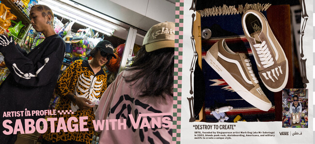 本作はMark SBTGのパンクロック・カルチャーと?のモチーフへの情熱がインスピレーション。VANSシューズのカスタマイズで人気を博してきたMark SBTGが、公式にコラボレートするのは今回が初。ブラウンを基調にしたOLD SKOOLとサンダルをはじめ、半袖と長袖のグラフィックTシャツ、シャツ、パンツ、ショーツ、キャップなどのアパレルがラインアップ。