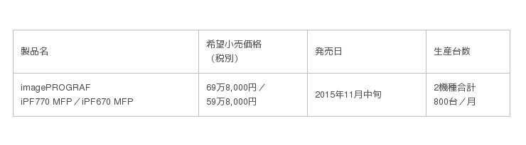 キヤノンは、大判インクジェットプリンター「imagePROGRAF(イメージプログラフ)」シリーズの新製品として、簡単操作でコピーやスキャンが可能な“imagePROGRAF iPF770 MFP”と“imagePROGRAF iPF670 MFP”の2機種を、2015年11月中旬より発売します。