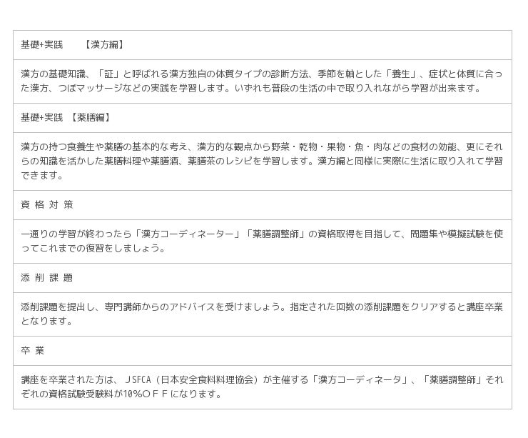講座内容は漢方コーディネーター(https://www.asc-jp.com/test/kampo.html)、薬膳調整師(https://www.asc-jp.com/test/yakuzen.html)それぞれの資格対策にもなるカリキュラムを採用しています。もちろん、初心者の方からでも安心して資格取得を目指せる内容となっています。
