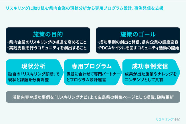 そこで、企業のリスキリング事例を多数掲載し、多数の専門パートナーと協働するリスキリングナビが広島県と連携し、県内企業のリスキリングの実践支援を行います。
