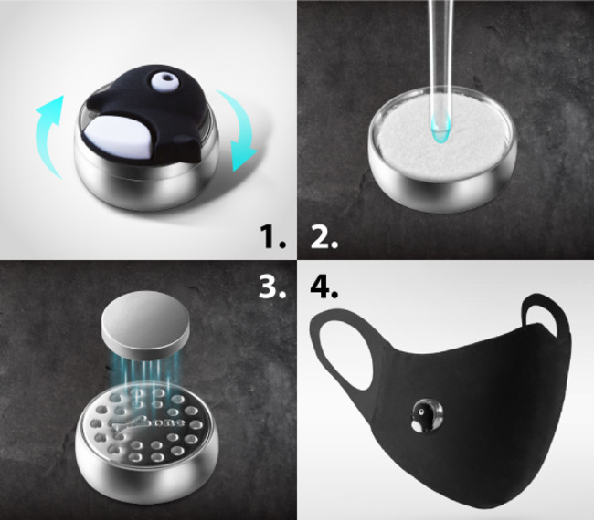 Bone Diffuser Clip の使い方は簡単、スクリューキャップ式のカバーを開き、中のコットンパッドに好みの香りを数滴ポタリ。キャップを閉めたら、あとは付属のマグネットでマスクを挟んで装着するだけ。