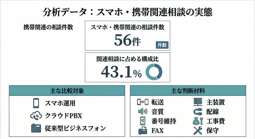 その結果、スマホ・携帯関連の相談は56件、関連相談の43.1%を占め、比較対象が固定電話同士ではなく「スマホで代替できるか」へ移っている実態が確認されました。