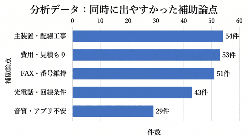 スマホ・携帯が話題になった相談では、同時に主装置・配線工事、費用・見積もり、FAX・番号維持、光電話・回線条件、音質・アプリ不安が多く見られました。