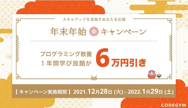 株式会社LABOTは、いつでもどこでも学習可能な、オンライン教材を活用したプログラミング学習サービス「CODEGYM プログラミング教養」を、2021年12月28日(火)より提供開始いたしました。またこれを記念して、お得な割引を行う「年末年始キャンペーン」も同日より開催しています。