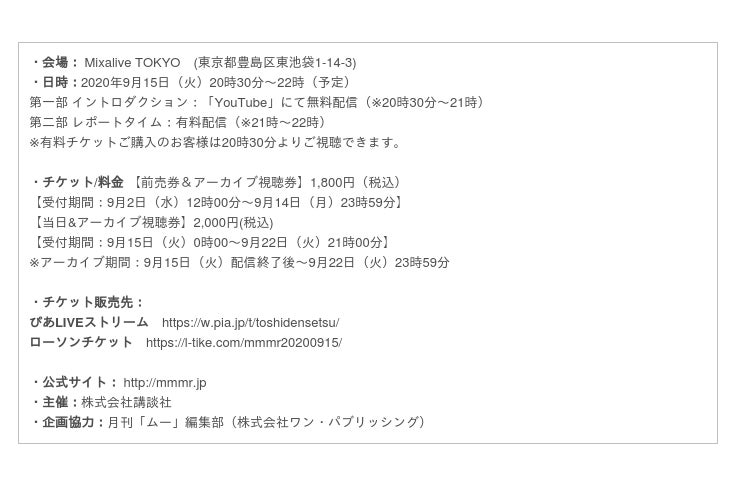 株式会社講談社(本社:東京都文京区、代表取締役社長:野間 省伸、以下「講談社」)が運営する、池袋に誕生したLIVEエンターテインメントビル「Mixalive TOKYO(ミクサライブ東京)」と株式会社ワン・パブリッシング(本社:東京都品川区、代表取締役 廣瀬有二 以下「ワン・パブリッシング」)の発行する世界の謎を解き明かすスーパーミステリーマガジン月刊「ムー」とのコラボLIVE配信番組「ムー×ミクサ ミステリー調査班 MMMR」が2020年9月15日(火)にスタートいたします。日本中のオカルト・ミステリーファンに向けて、毎月「Mixalive TOKYO」から生配信します!