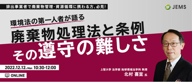 「ITで環境問題に挑む」をコーポレートスローガンに掲げる株式会社JEMS(本社:茨城県つくば市、代表取締役:須永裕毅)は、2022年12月12日(月)に排出事業者の廃棄物管理担当者様向けに、上智大学にて環境法学・行政法学を専攻されている北村 喜宣氏をお招きし、「廃棄物処理法」をテーマとした無料のオンラインセミナーを開催します。
