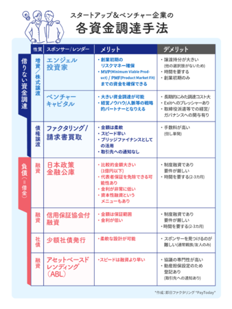 資金調達は、大きくデットファイナンスとエクイティーファイナンスの2つに分類できます。デットファイナンスは融資や社債調達を指します。エクイティーファイナンスは、株式発行による資金調達(もしくは株式譲渡)の手法が用いられ、スポンサーはエンジェル投資家/ベンチャーキャピタル等が選択肢となります。エクイティーファイナンス、融資、社債、ABL、ファクタリングを“借りない資金調達”と“負債”という2つに大きく分類し、メリット/デメリットをを分析しました。皆様の判断の一助になればと思っております。