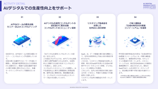 AIとデジタルツールの普及、AIデジタル生産性認定コンサルタント(以下、認定コンサルタント)の認定・普及とともに、これまでの活動で多くの企業を支援してきた、リスキリング助成金を活用した人材研修やIT導入補助金「生成AI時代のDX推進コンソーシアム」は引き続き行って参ります。