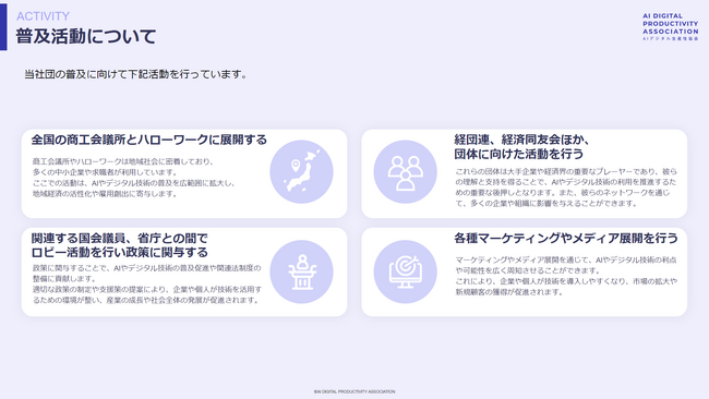 AIやデジタルツールの普及と活用するためのリスキリング研修、それらにより企業や働く個人の生産性を高め、利益増や賃上げを実現し、日本全体の底上げを実現する。という当社団の目的のため、全国の商工会や経済団体、国会議員や省庁、各業界団体へ働きかけ、社団と認定コンサルタントの普及を行って参ります。