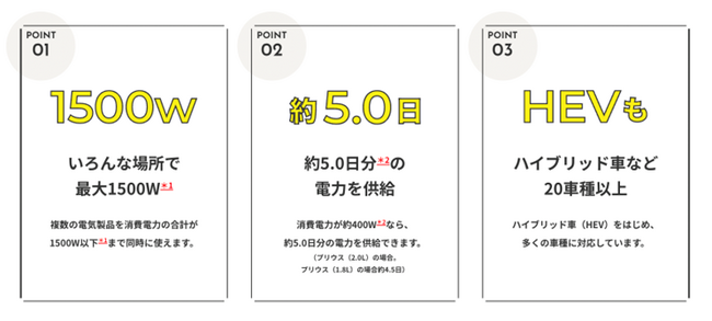 クルマから電気を取り出し「移動できる電源」として使えます。いつもの暮らしから、もしもの非常時まで、“電気が動く” ことで、場所に縛られることなく、うれしさや安心が次々と広がっていきます。