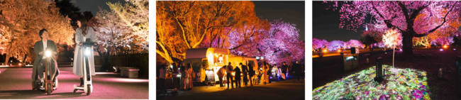 今回の取り組みでは、3年ぶりの実施となる新宿御苑の夜桜ライトアップイベントの一部演出にて、トヨタが開発した水素を使って走る燃料電池自動車「MIRAI」や、燃料電池バスと大小バッテリーをセットにした移動式発電・給電システムである「Moving e」による給電を活用。また、期間限定で昼間に開催予定のマルシェでは、人気レストラン「TREE by NAKED」が監修したお花見メニューを発電機を使わずに飲食の調理が可能な「FCキッチンカー」で提供。給電という動く電源ならびにカーボンニュートラル社会の実現を目指して開発する水素自動車によって、光のアートの可能性を広げるとともに、環境省が維持管理をする国民公園・新宿御苑の自然や環境に最大限配慮したお花見の提供に協力します。