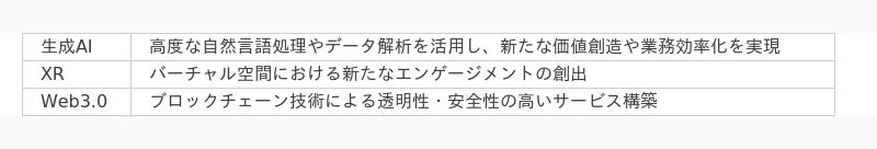 生成AIやブロックチェーン、メタバース、XRなど、最先端のソリューションをご紹介。具体的な導入イメージから事例ベースのコンサルティングまで、一貫して体感いただけます。
