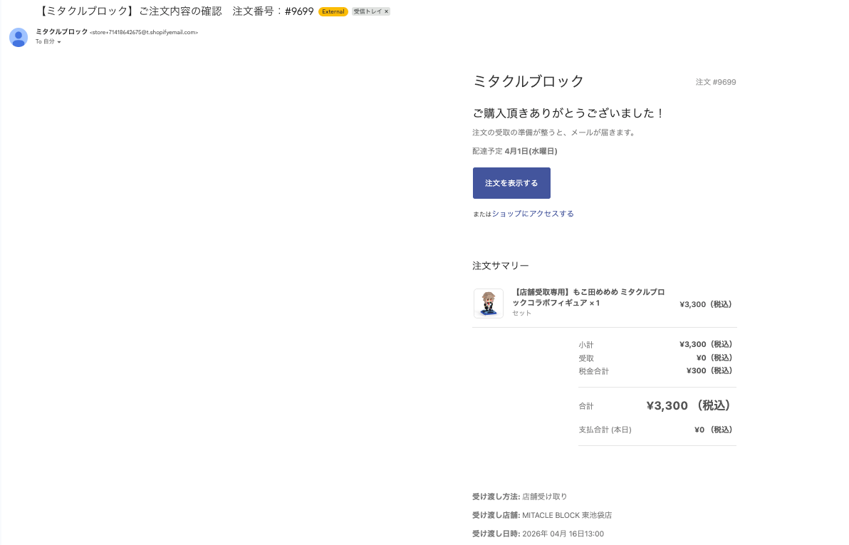 購入確定後、ご登録メールアドレス宛に、タイトルに「【ミタクルブロック】」が含まれた注文確認メールが届きます。発送日まで保管してください。