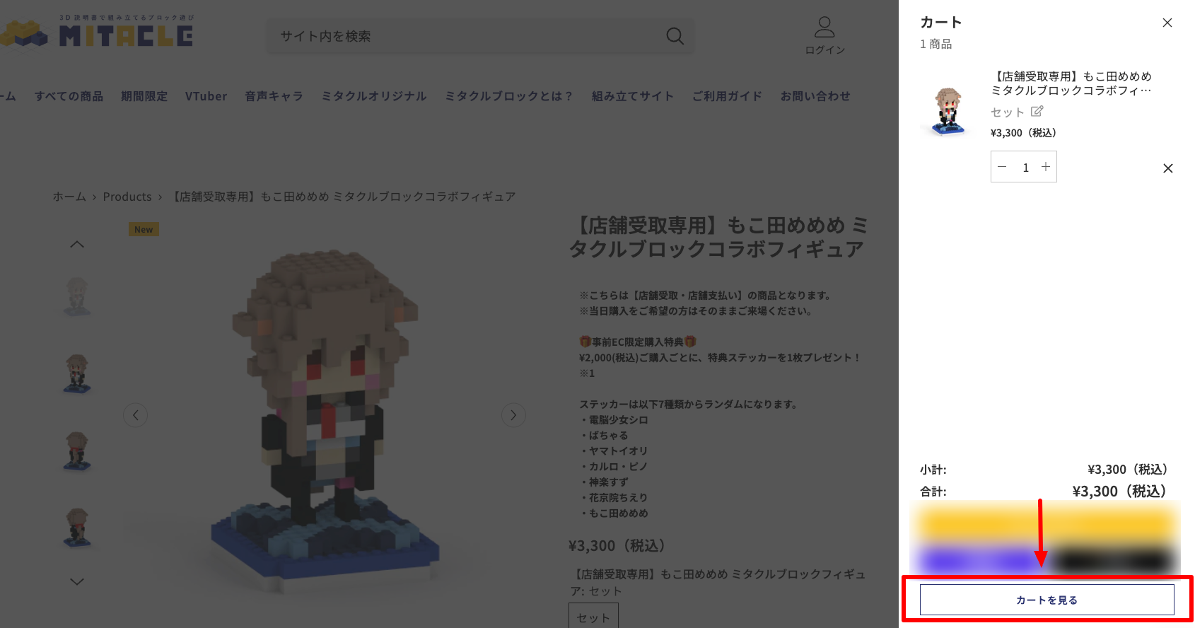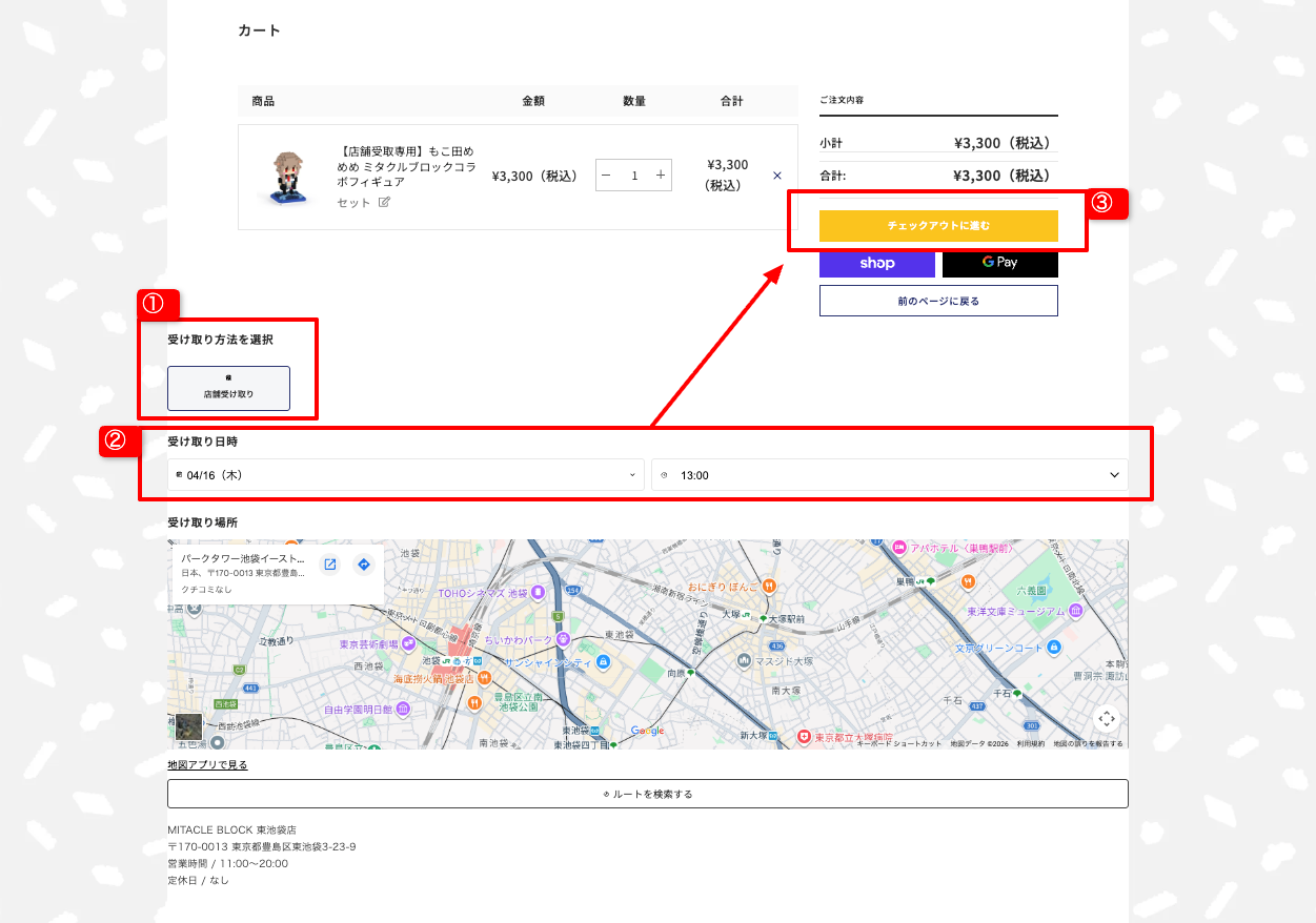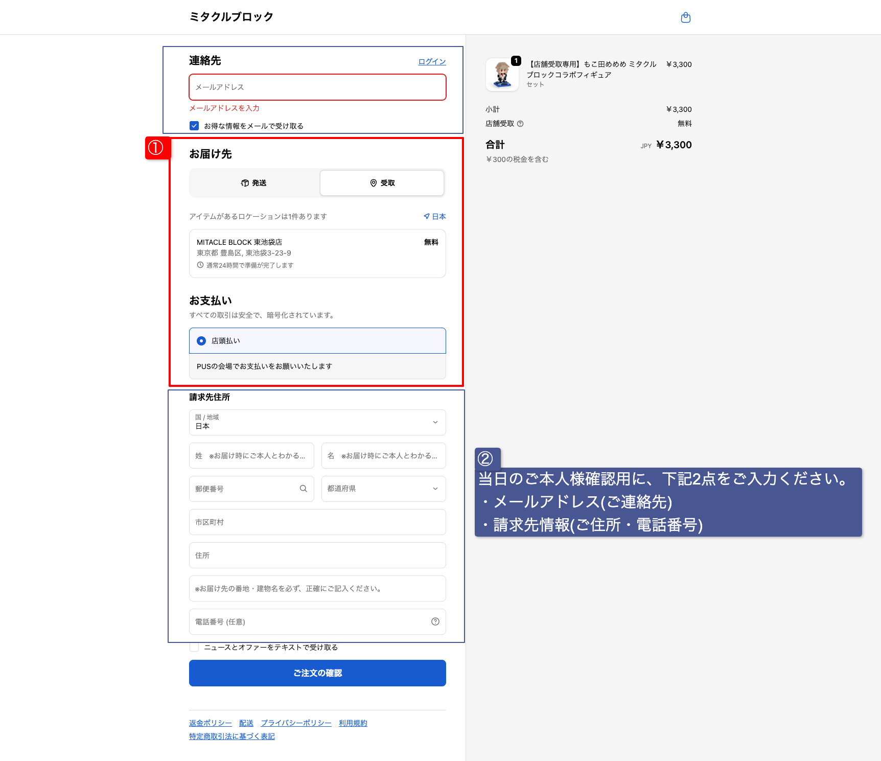 お届け先が「受取」になっていることを確認いただき、お支払い方法を、店頭払い(MITACLE BLOCK 東池袋店にてお支払い)と選択ください。