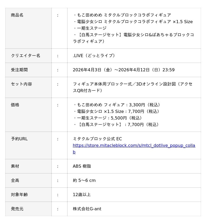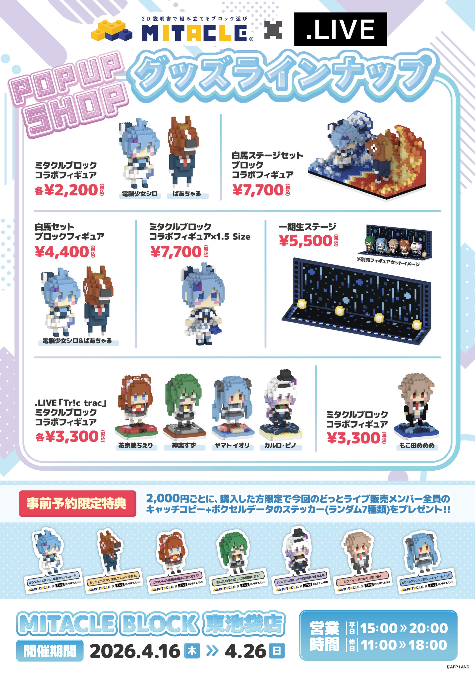 今回のコラボレーションでは、.LIVE一期生の「もこ田めめめ」や、電脳少女シロの1.5倍サイズフィギュア、一期生のステージセットなども新たにラインナップに加わります。事前予約は2026年4月3日(金)より、過去にミタクルブロック化したメンバーの再販も含めミタクルブロック公式オンラインストアにて受付開始いたします。また、ミタクルブロック ポップアップストア東池袋店にて4月16日(木)より期間限定で販売を行います。