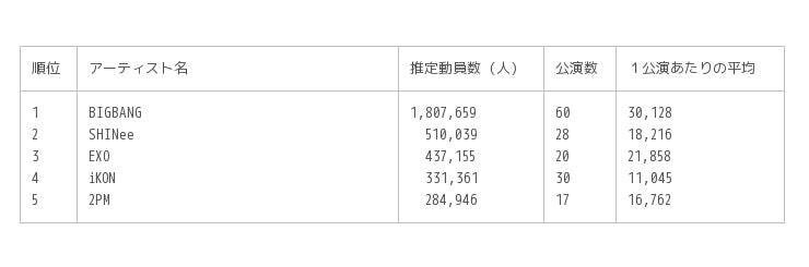 音楽ライブ情報サービス「LiveFans」が2016年 年間観客動員ランキングを発表、1位は推定180万人動員のBIGBANG