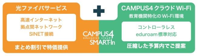 今回、提供開始する「CAMPUS4 スマート・イン」は、より多くの学校に最新のWi-Fi環境を整備していくことを目的に、現在ご利用中の光回線サービスを当社が提供する光回線サービスに乗り換えることで、新規予算を追加することなくWi-Fi環境を整備することも可能な学校法人限定のまとめ割引プランです。また、「CAMPUS4」内での一括提供のため、窓口の一本化により、煩雑な事務手続きや運用管理もよりスムーズになります。