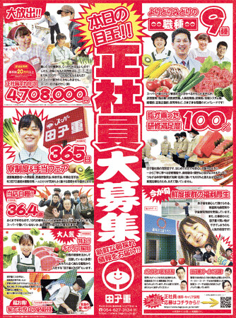 正社員募集をより広域に告知するため、新聞広告を出稿。スーパーには多様な職種があることや、手厚い福利厚生などの知られざる魅力を伝えることを目指した。朝刊という朝に届くメディアであることを活かし、「朝採れ情報」というキーワードで特売のチラシのように見せつつ、記事の面白さにひかれて読んでいくと実は正社員募集であることが伝わる構成とした。新聞の紙質を活かしてチラシらしく見せるために、あえて解像度を粗くした写真や掠れたインクの雰囲気を作るなど、デザイン面にもこだわって制作した。直接社員募集に関係のない読者に対しても、企業イメージ向上につながる取り組みとなった。