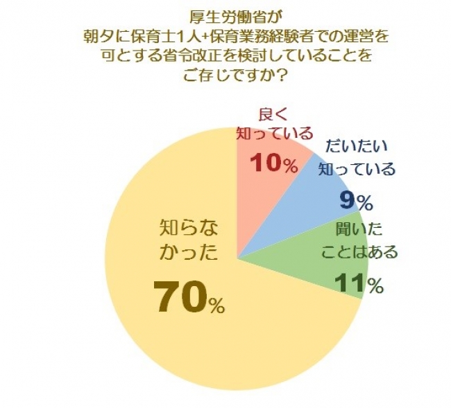 厚生労働省は、朝と夕方に限り、現状2人以上の配置が定められている保育士の数を1人に減らすことを検討しています。この省令改正案について保育士さんを中心とする100名を対象に、意識調査を行いました。