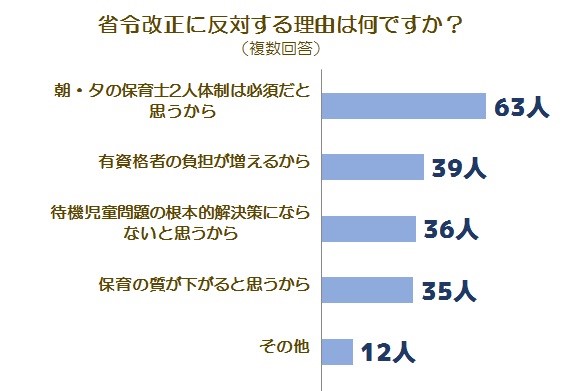 一方で反対理由の多数を占めたのが「朝夕は保護者対応などで忙しく、保育士2人体制は必須だと思うから」というもの。実に71人の反対回答者のうち63人がこの理由を挙げていました。その他「有資格者の負担が増えるから(39人)」「待機児童問題解消の根本的な施策になっていないと思うから(36人)」「保育の質が下がると思うから(35人)」というご意見の他、「子どもに何かあったときの対応は1人では厳しく、責任も重い。(20代/女性)」などの声も寄せられました。