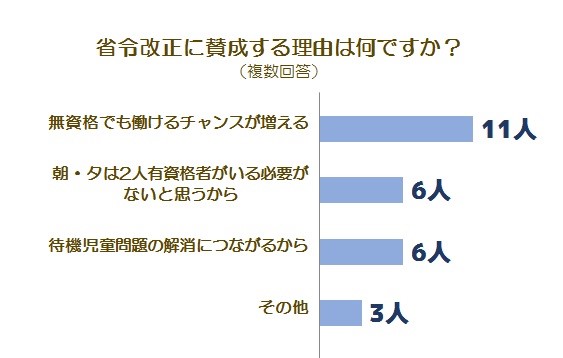 改定に賛成する方の意見としては、「無資格でも働けるチャンスが増えるから」というご意見が最も多く、その他「既にそのような体制を取っている」などのご意見もありました。