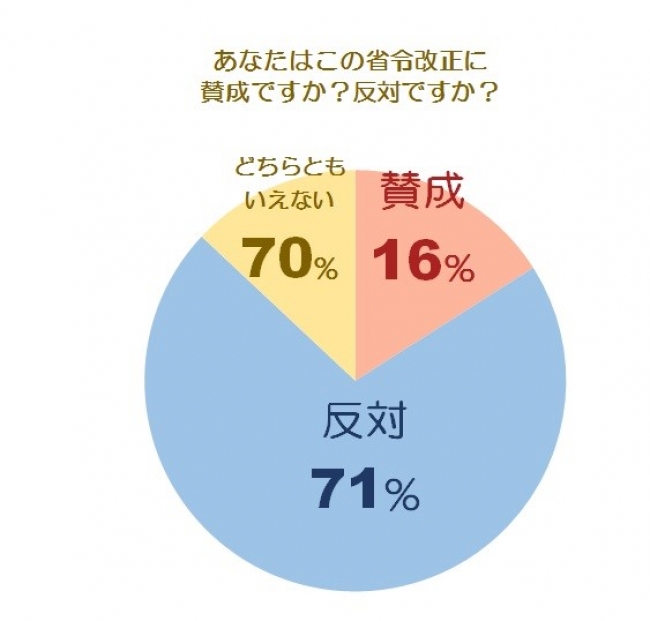 続いて、改定の意図や内容を伝えたうえで、省令改定の賛否について伺ったところ、71%の方は「反対」と回答。「賛成」というご意見はわずか16%にとどまりました。