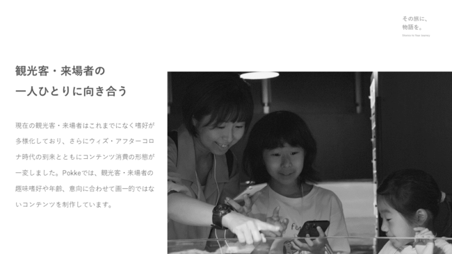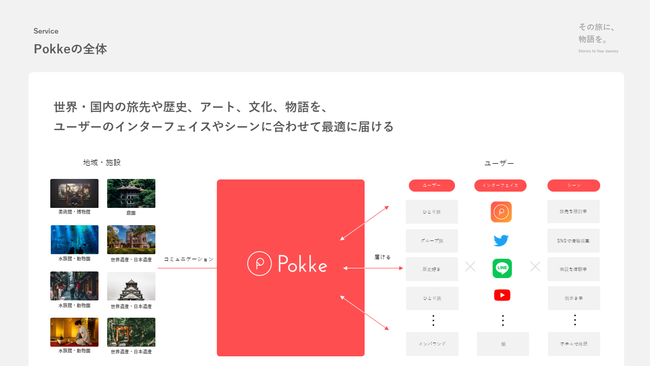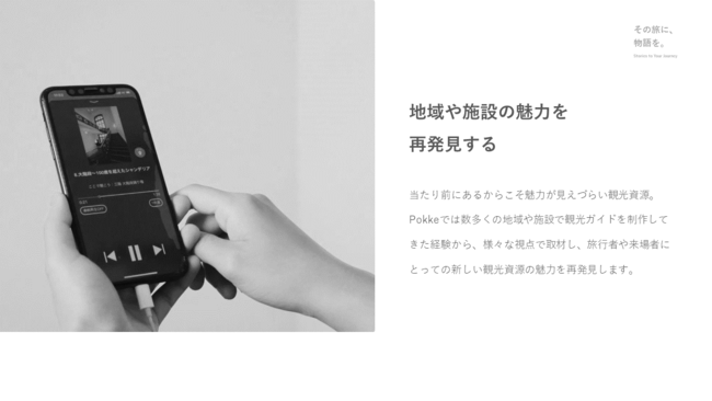 Pokkeは「旅先の物語を届ける」をコンセプトとする、旅と学びの観光DXソリューションです。美術館や博物館向けの音声ガイドや街歩き型のトラベル音声ガイドを主体としたスマートフォン・WEBアプリとして展開しています。