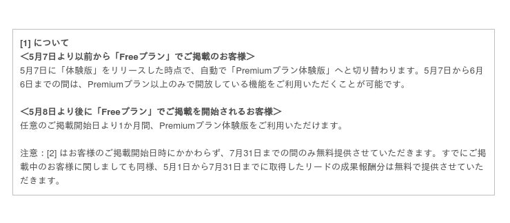 「リード獲得成果報酬」と「一部のPremiumプラン(有償掲載)」の機能を期間限定で「無料提供」