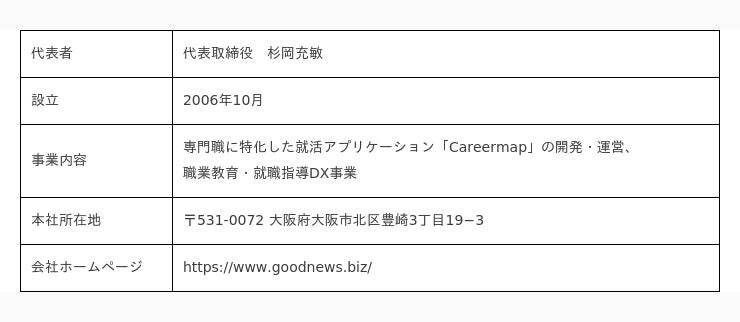 「職業教育のDXによって、専門学生をエンパワーメントする」をミッションに掲げる株式会社グッドニュース(本社:大阪市北区、代表取締役社長:杉岡充敏、以下「グッドニュース」)は、既存株主、新規投資家を引受先とした第三者割当増資により2.7億円の資金調達を実施しました。今回の増資により、学生、学校、企業をつなぐ職業教育プラットフォーム『Careermap(キャリアマップ)』の新機能開発、セキュリティ強化を進め、事業成長によって「すべての人が、ともにイキイキとはたらく未来を創る」パーパスの実現を目指してまいります。