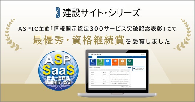 建設業界に特化したクラウドサービス「建設サイト・シリーズ」がASPIC主催「情報開示認定300サービス突破記念表彰」にて「最優秀・資格継続賞」を受賞しました。