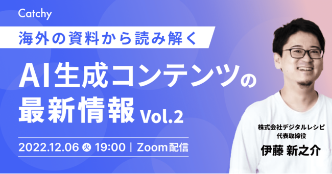 「ワンクリックイノベーション」を目指すテクノロジースタートアップ 株式会社デジタルレシピ(本社:東京都渋谷区、代表取締役:伊藤新之介)が提供するAIコピーライティングツール「Catchy(キャッチー)」は、前回、満足度90%以上と大変ご好評をいただきましたAI生成コンテンツの最新情報に関するウェビナーの第2弾として、12月6日(火)に「海外の資料から読み解くAI生成コンテンツの最新情報 vol.2」ウェビナーを開催します。