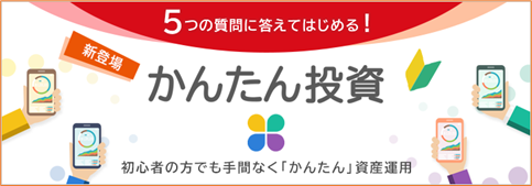 本サービスは、資産形成の重要性が増しているなか、「何から始めて良いかわからない」、「どんな商品を選べば良いかわからない」といった悩みをお持ちの方にピッタリのサービスで、Pontaポイントやクレカ積立も利用可能です。「かんたん投資」では、5つの質問への回答を分析し、年齢(世代)に応じた「安定性」、「バランス」、「積極性」の観点からお客さまにおすすめのコースを診断し、4種類の専用ファンドから最適なファンドをご提案します。