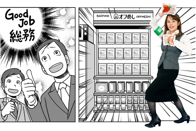 心幸が提供する「オフめしイート&ストック」は、人気の置き社食サービス「オフめし」の常温保存そうざい(賞味期限は約1年)を利用した、食べながらそなえる新しい備蓄サービスです。