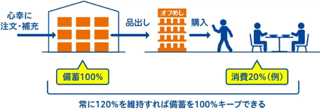 備蓄用と消費用の常温保存そうざいを常に準備しておくことで、備蓄用の惣菜がいつも最新の賞味期限のものとなるため、いざ災害が起きた際にも、賞味期限切れということがありません。また、賞味期限切れによる一斉破棄のリスクも無くすことができます。