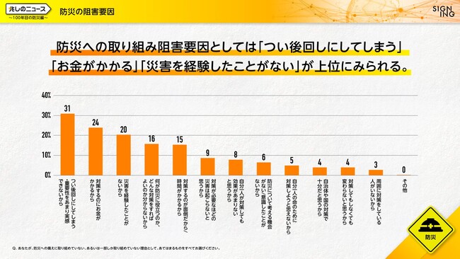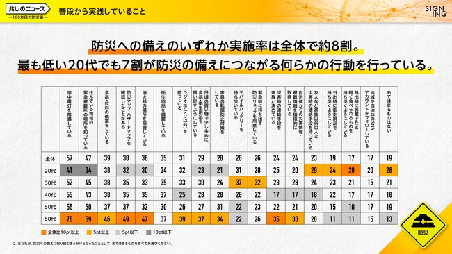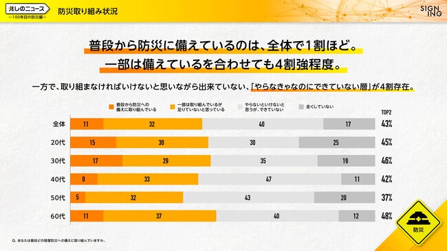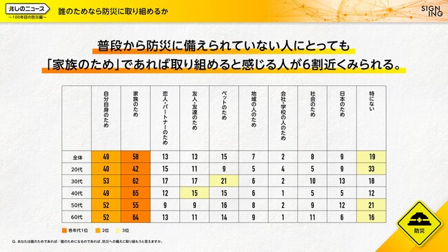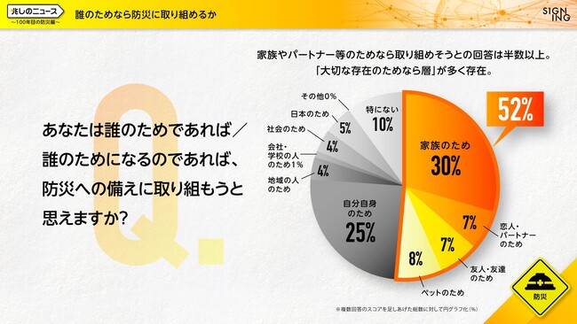 「ビジネスの課題」と「社会の課題」を同時解決する株式会社SIGNING(サイニング、本社:東京都港区、代表取締役社長:亀山淳史郎、以下SIGNING)は、9月1日の防災の日、ならびに関東大震災100年という日に、災害に備えるきっかけを作るために、防災に関する意識調査を実施いたしました。本調査で防災の備えについて質問したところ、災害大国日本において普段から防災に取り組んでいる人は約1割と極僅かで、取り組まなければいけないと思いつつ出来ていない人が約4割という実態の中、誰のためにならば取り組めるか、という問いでは、家族やパートナー、ペットなど、「大切な存在のため」なら防災を実施したいという回答が半数以上を占め、「自分のため」という回答をすべての年代で上回りました。